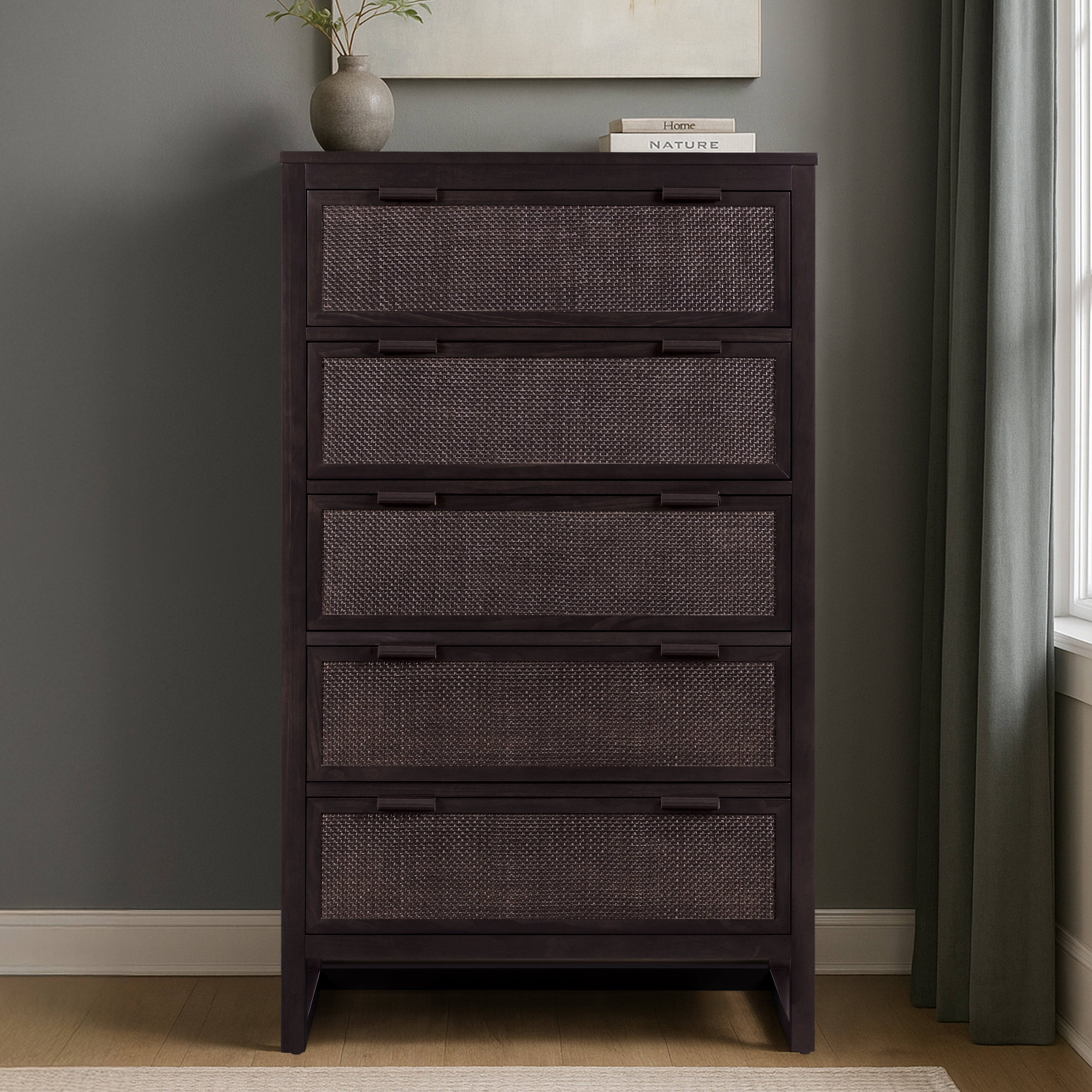 Built from a solid pine wood frame with MDF panels finished in acacia veneer, the dresser provides strength and durability for daily use. Rattan inlay drawer fronts add texture and soften the clean lines, while the mocha brown finish adds warmth. Five drawers provide layered storage for folded clothing, accessories and seasonal items.