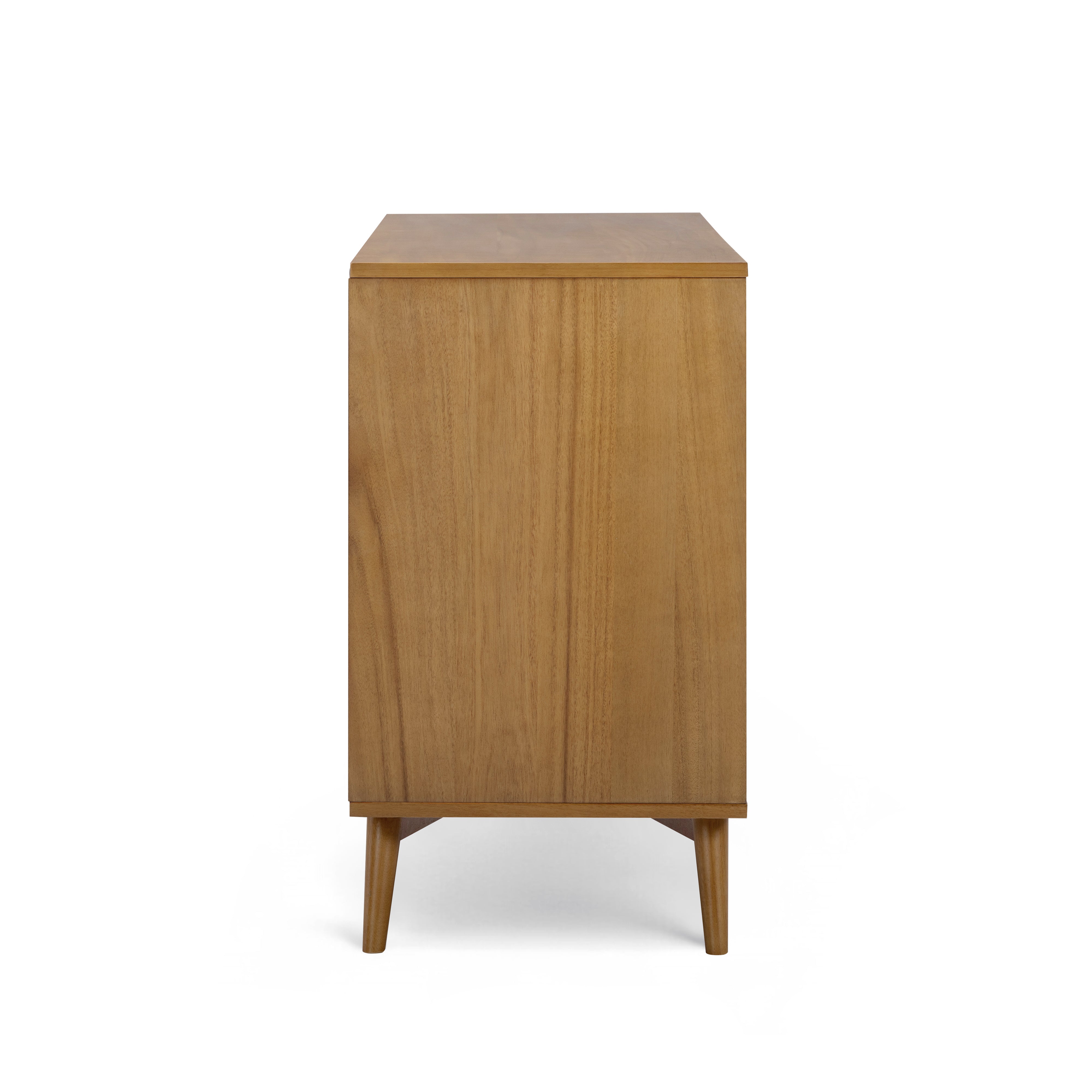 Push-open doors and concealed hardware maintain a clean, streamlined appearance. Constructed from engineered wood with acacia veneer and supported by solid wood elements, the sideboard delivers stability and durability for regular use. Designed to keep interiors organised and visually balanced, it offers storage that works seamlessly within modern homes.